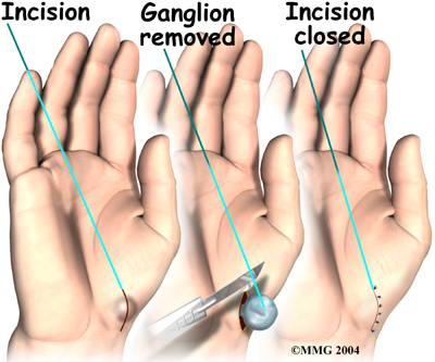 To , a small incision is made in the back of the wrist. The tendons that run across the back of the wrist and into the fingers are retracted (or moved) out of the way. This allows the surgeon to see the ganglion and follow it down to where it attaches to the wrist capsule. Once the surgeon locates this stalk, the entire ganglion is removed, including the area where it attaches to the joint capsule. The joint capsule may or may not need to be repaired with sutures. Finally, the skin incision is closed with sutures.