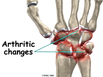 Many wrist injuries, such as fractures and sprains, heal fairly easily. However, they can lead to problems much later in life. The injury changes the anatomy of the wrist just enough so that the parts no longer work smoothly together. The changes from the injury cause a lot of wear and tear on the wrist joint. Over time, this wear and tear degenerates the tissues of the joint, leading to wrist osteoarthritis. Doctors may also call this type of degeneration posttraumatic arthritis.