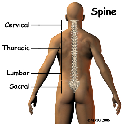 The spine is made up of 24 bones called vertebrae that stack on top of one another. Each vertebra has a ring of bone that encases and protects the spinal cord. When the vertebrae are stacked one on top of the other, these rings of bone create a hollow tube called the spinal canal. The spinal cord runs through the spinal canal from the brain to the lower spine. Between the vertebrae are intervertebral discs. The intervertebral discs cushion the spine and make it flexible. There are also two facet joints between each vertebra of the spine. The facet joints are located on the back of the spinal column in the lumbar and thoracic spine. In the neck, or cervical spine, they are located more to the side of the vertebra.