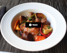 For this recipe you will need Italian sausage, olive oil, chicken thighs, sweet peppers, red onion, yellow onion, Yukon gold potatoes, Italian parsley, black pepper, and Italian herbs.
