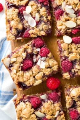 These tasty bars are made with whole wheat flour, coconut oil, maple syrup, pure vanilla extract, almonds, old fashioned oats, ground cinnamon, kosher salt, raspberry jam, and fresh raspberries.