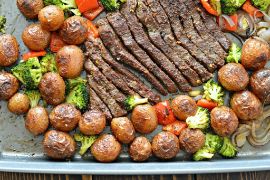 This recipe combines small red potatoes, an onion, broccoli, red pepper, garlic, olive oil, ground cumin, and oregano with flank steak.