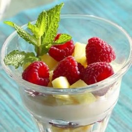 This is a quick, easy and delicious recipe that combines your favorite flavor of yogurt with fresh pineapples and raspberries. Yogurt contains healthy bacteria that your body needs, while pineapples and raspberries are loaded with vitamins and antioxidants such as vitamin C, E, magnesium, folate, and omega-3 fatty acids. Try this recipe today for a nutritious treat.
