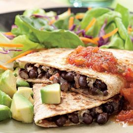 This satisfying recipe combines avocado, fresh salsa, whole-wheat tortillas, black beans, and Monterey Jack cheese. This meal only takes about 15 minutes to make and it’s loaded with vitamins, antioxidants, and minerals. For an extra boost of nutrients, serve these tasty quesadillas with a leafy green salad.